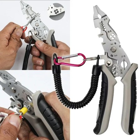 - ব্যবহারিক মাল্টি-ফাংশন টুল: তারের কাটা, স্ট্রিপিং, ক্রাইম্পিং, উইন্ডিং, স্প্লিটিং, ক্ল্যাম্পিং এবং রেঞ্চিং এর মতো বিভিন্ন ইলেকট্রিশিয়ান অপারেশন প্রয়োজনীয়তা পূরণ করে